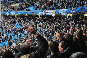 Belle présence, comme toujours en déplacement, des ultras Ajacieden dans le City of Manchester Stadium lors de cette rencontre de Ligue des Champions entre l'Ajax Amsterdam et Manchester City...
